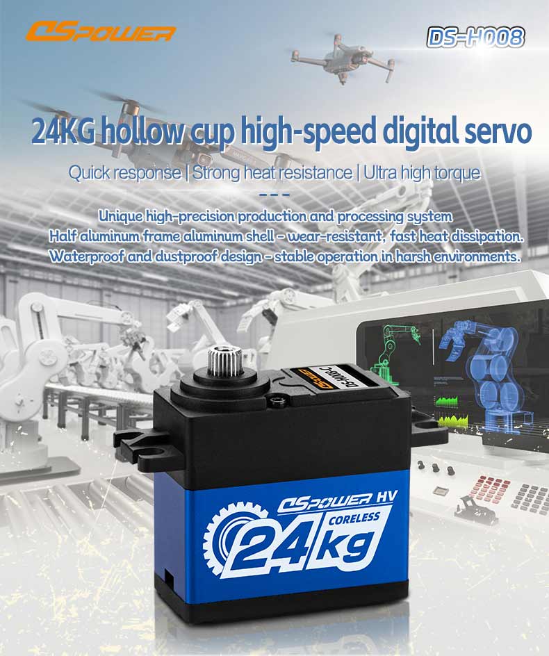 The H008-C is equipped with a coreless motor and a 25T servo rocker arm. This combination not only provides lower energy consumption but also makes it compatible with most products. Its size is exactly the same as the market-leading products, and its performance and manufacturing quality reach 95% of the market-leading products, but its price is less than half of them.