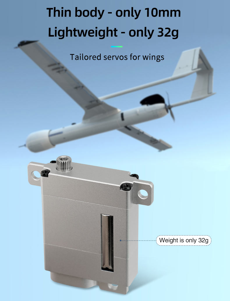● Ultra Thin All Aluminum Structure:DS-W009A is made of all aluminum material, with an ultra thin width and lightweight body. It can support stable driving of control surfaces in strong airflow at high altitudes, minimizing flight loads.
