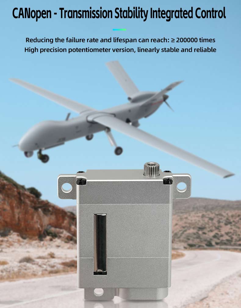 ● Built in quadruple protection mechanism:Built in stall protection, voltage protection, over-temperature protection and current protection, and the gear virtual position ≤ 1° ensure that the drone can still accurately control the wing angle under complex working conditions